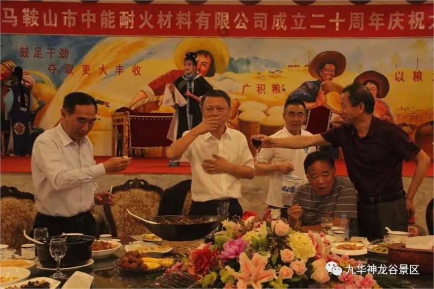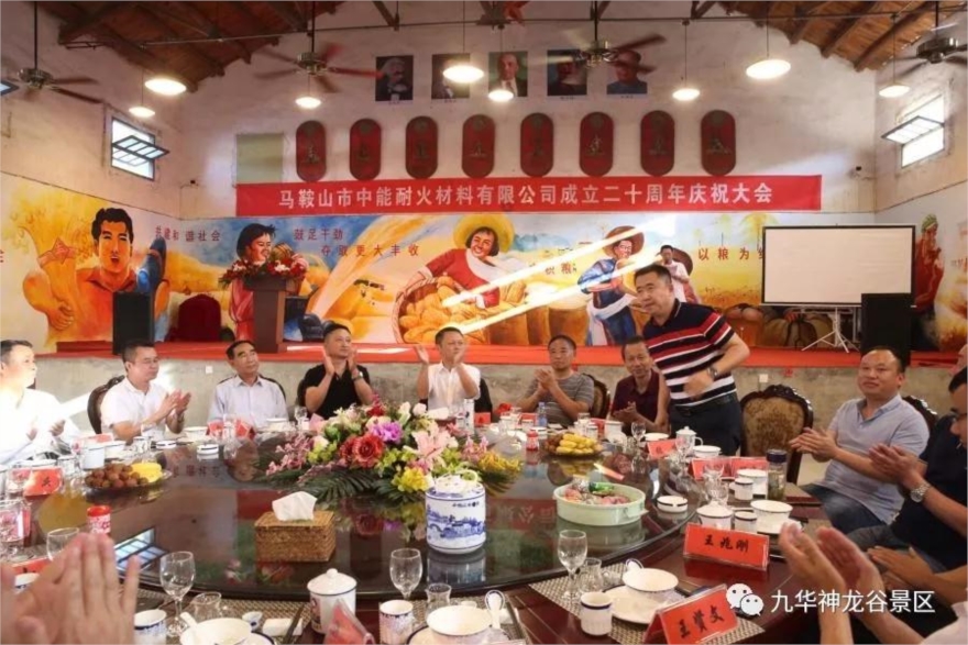 2019年5月22日,马鞍山市中能耐火材料有限公司二十周年庆典活动在富贵陵阳旅游景区隆重举行。中能公司领导、员工代表、行业协会领导、经销商、供应商代表及媒体人员共百余人齐聚景区,共同见证和庆祝中能公司二十周年的丰收,并祝福中能公司未来再接再厉,再创辉煌!