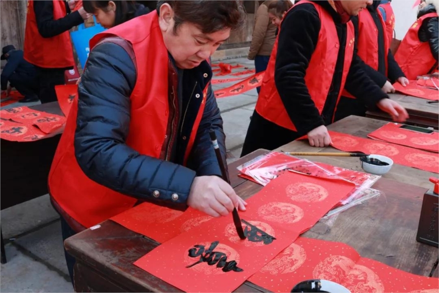 新年的钟声即将敲响,年味儿越来越浓。 手写春联在大红纸上用饱蘸浓墨的毛笔,现场挥洒书写,为春节点染欢乐的色彩。手写春联是中华民族流传千年的优秀文化,也是重要的民俗活动。铜陵市收藏家协会联合犁桥水镇通过组织书法名家文化下乡和开展爱心公益活动,书法家们不仅为老百姓送来了“福”气和祝福,也是传承中华优秀传统文化的有效形式,为铜陵市文化下乡和社会科学实践贡献了一份文艺力量。此次活动旨在进一步贯彻落实乡村振兴战略,坚定文化自信,更好的传承中国优秀传统文化,激发人民群众内生动力。正所谓“福字送上门,群众笑欢颜,文化下基层,公益暖人心!”