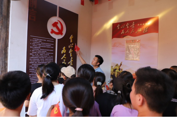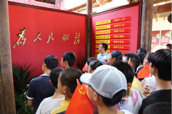 透过一处天井,一大群学生的身影在四合院内四处走动,这里是犁桥水镇纪念建党100周年“为人民服务”主题展主展区。近千平方米的展区,楼上、楼下陈列着300多件老物件。陶瓷茶缸、洗脸盆、摆动不停的老座钟、泛黄的帆布书包和古朴的梳妆台、木质的箱柜,还有各式各样的毛主席像章,这些颇具年代感的物品上面无一例外地印有“为人民服务”的题词。许多物件都是现场参观的学生第一次见到。聆听着讲解员的讲解,现场参观的和平初级中学学生们对这段尘封的历史有了逐渐清晰的认识。
